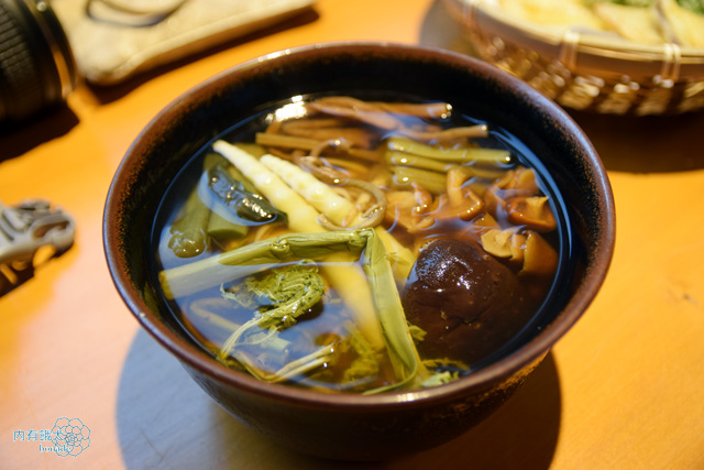 熱熱的蕎麥麵使用清爽的柴魚高湯,上面放了許多山菜