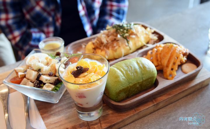 整份餐點含歐姆蛋、沙拉、優格、麵包、薯格格