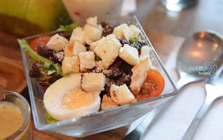 沙拉裡除了一般的生菜及水果,還放了一片板豆腐,可惜的是沙拉醬味道偏重、偏鹹