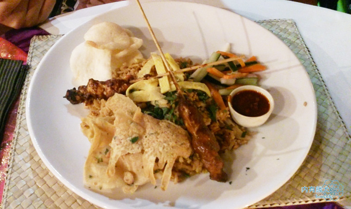 整份炒飯除了本體外還有蝦餅、涼拌小黃瓜、沙嗲、一種薄煎餅