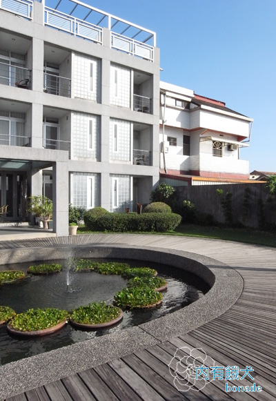 後面有一個半露天的座位區,小小的噴水池被木棧道環繞著