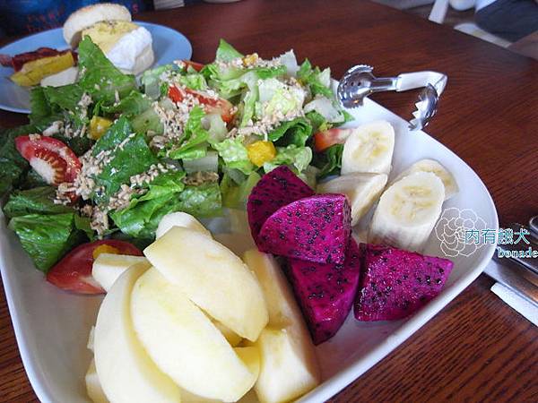 先送上一大盤沙拉和水果,沙拉用的是油醋醬