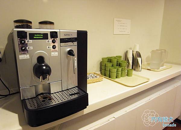 休息區有一個角落有提供冰水、自動式咖啡機,還有熱毛巾可使用