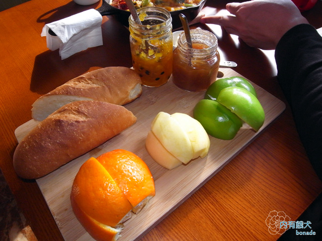 送上自製的蜂蜜法式麵包、兩瓶果醬、鹽奶油、水果三樣